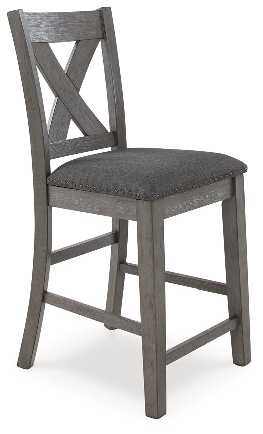 Details | Includes counter height dining table and 6 counter height bar stools, Table made with hardwood solids, acacia veneer and MDF substrate, Stools made with solid hardwood frames, Antiqued gray wash finish, Polyester upholstery, Foam cushioned seats, Nailhead accents, Assembly required | |