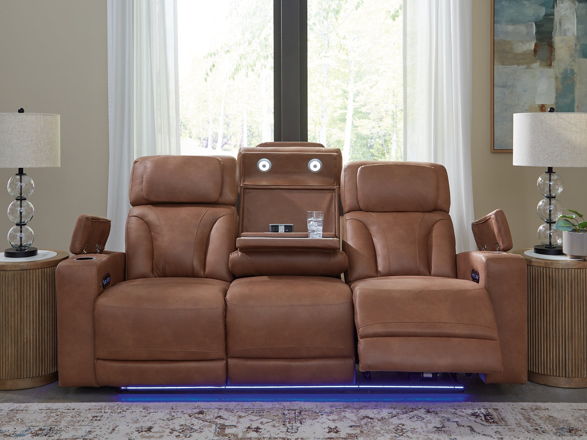 Ready to relax in style? Our luxurious power reclining sofa doesn't just look fantastic—it also delivers creature comforts and fabulous functionality. Adjustable headrests ensure a perfect TV view no matter how far back you recline. Faux leather upholstery, a drop-down table with reading lights and ambient LED lighting go beyond your typical theater-style experience. Movie nights and chill time just got a whole lot sweeter.
