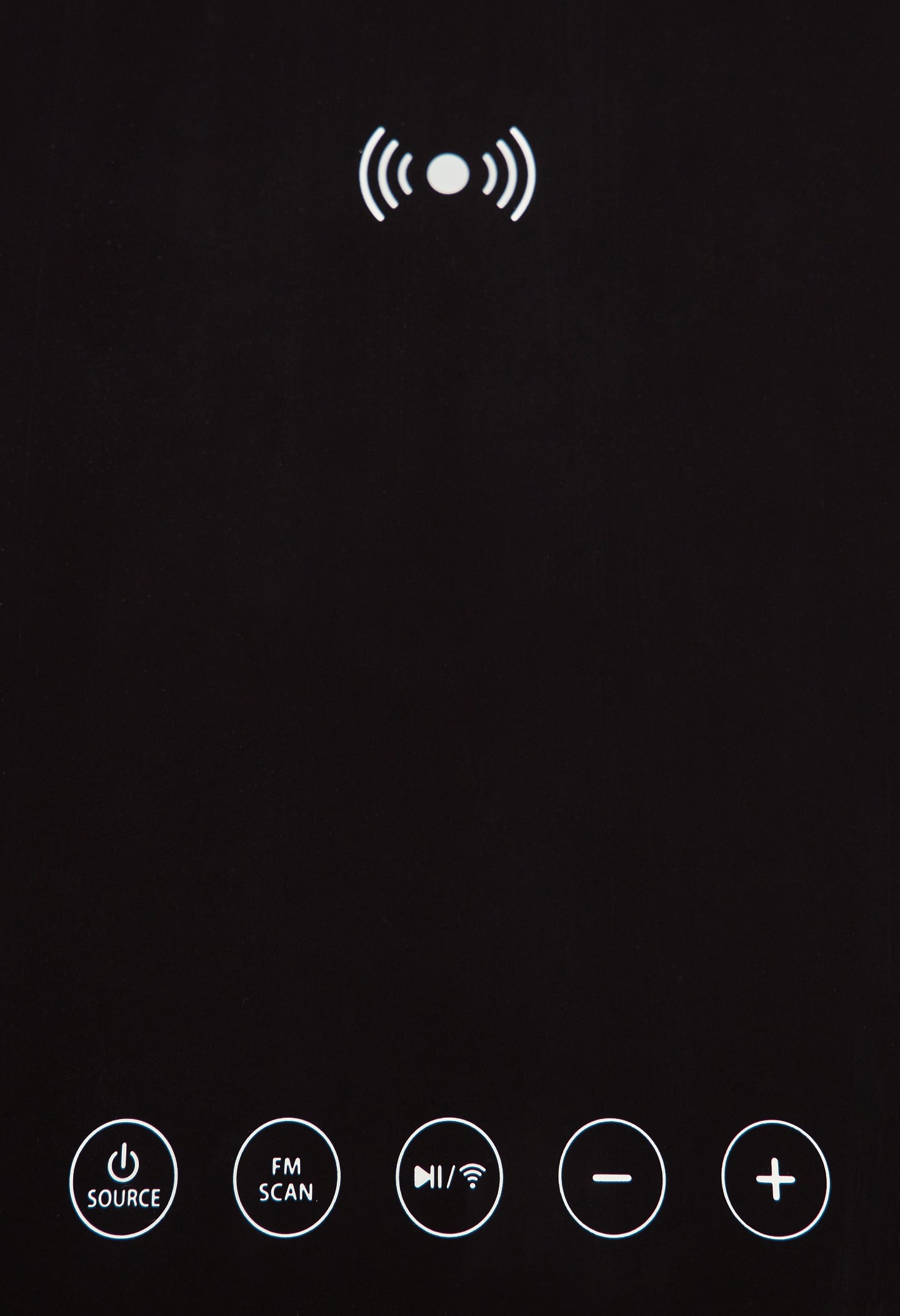 Details Made with solid and engineered wood and metal, Black finish on metal and wood, Glass top, Gray polyester fabric on sides, Tabletop with wireless charging and touch-button controls, 6.5" full-range speaker and 2" tweeter speaker, Wireless connection; FM antenna; aux input; USB charging port, Fixed shelf, Assembly required