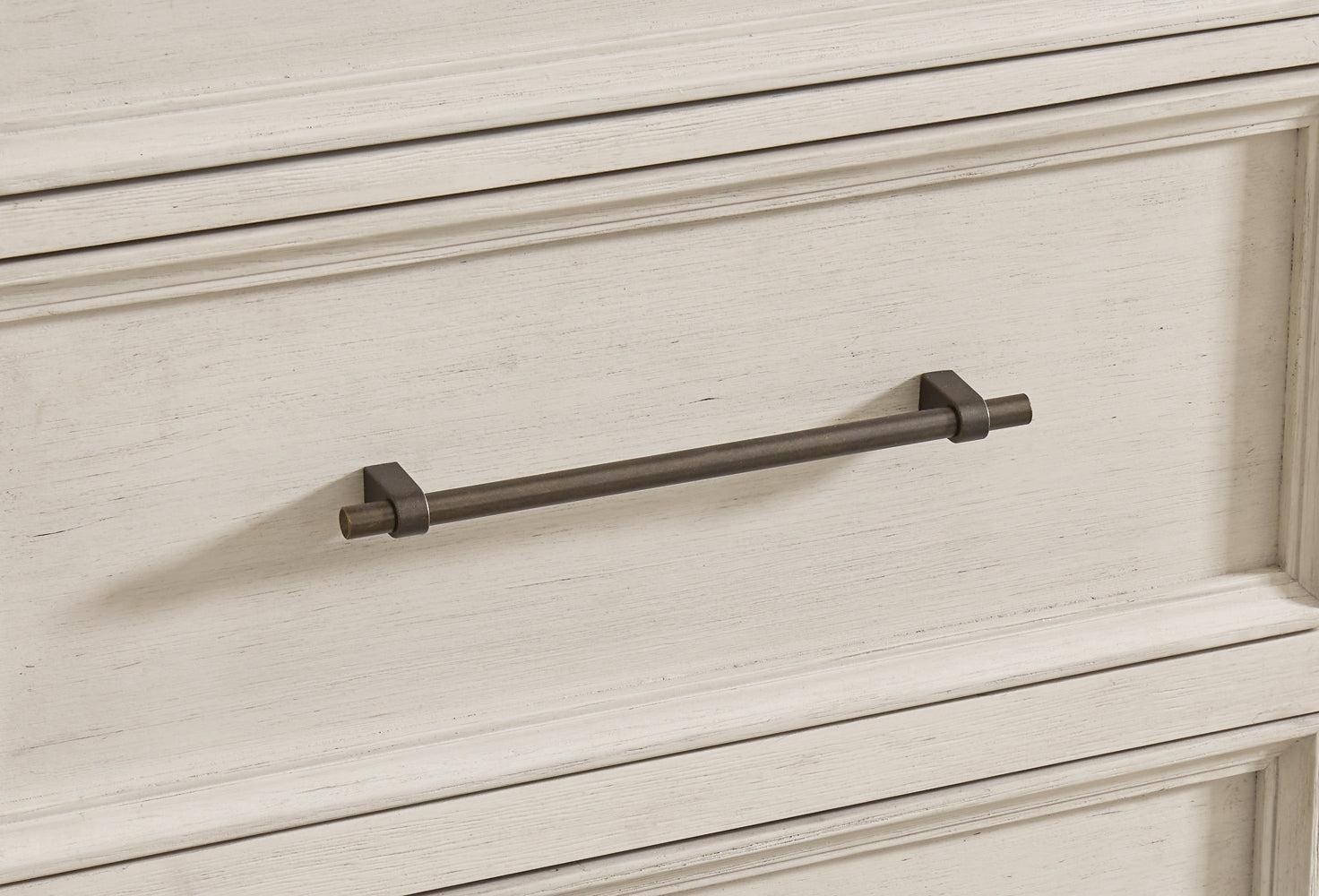 | Details | Includes dresser and mirror, Made with hardwood solids, veneers and MDF substrates, Two-tone finish (antiqued white and light gray wood tone), Dark bronze-tone bar pulls, 2 glass-front cabinets, each with single storage shelf, 5 drawers with fully finished interior, dovetail construction and heavy duty ball-bearing side glides (top drawer felt lined), Mirror attaches to back of dresser | |